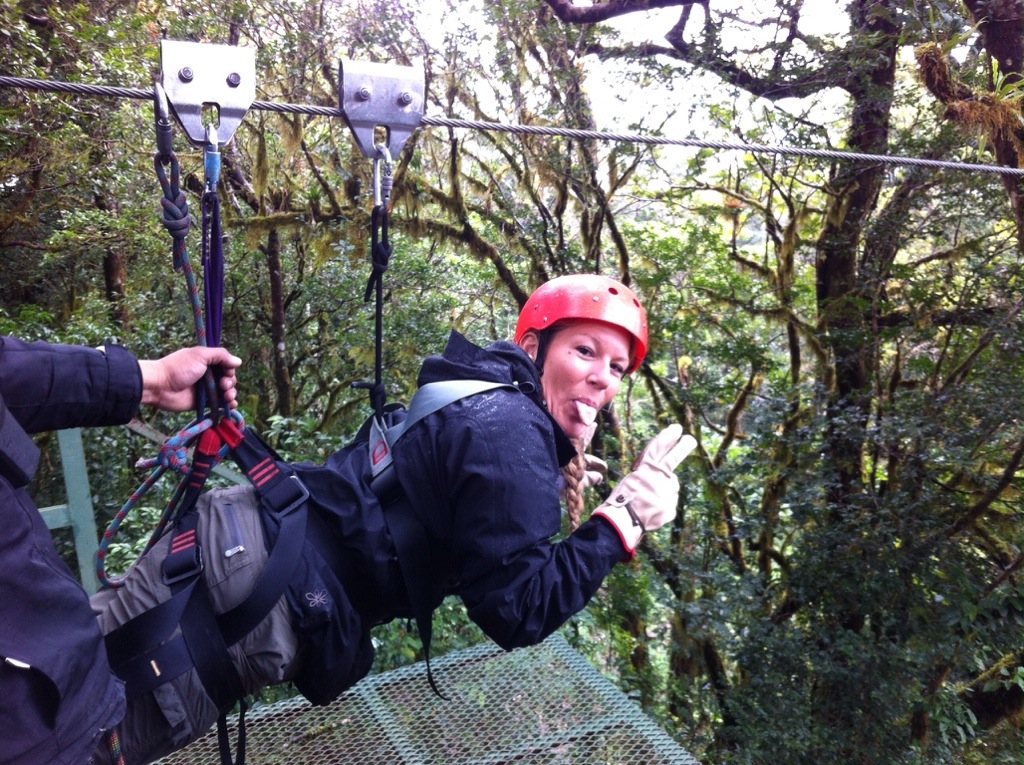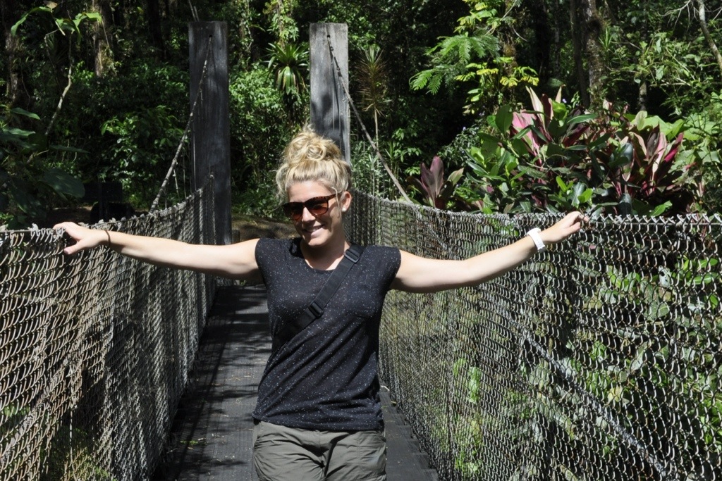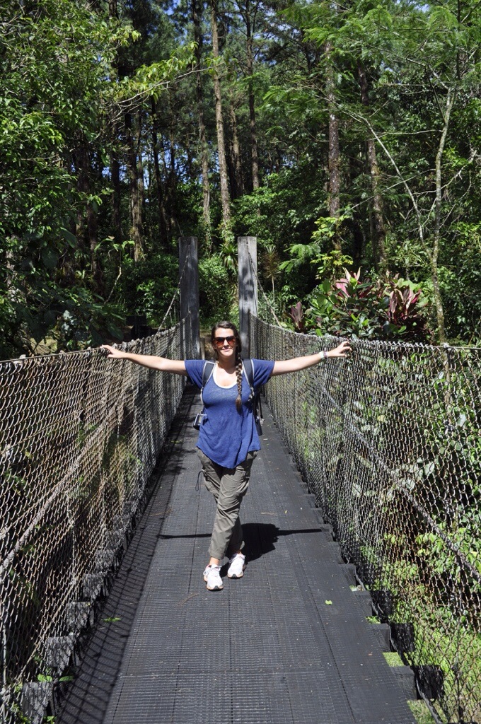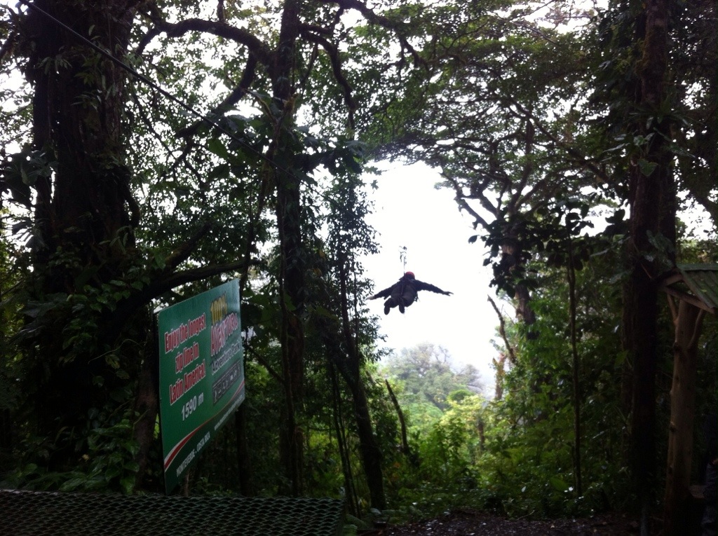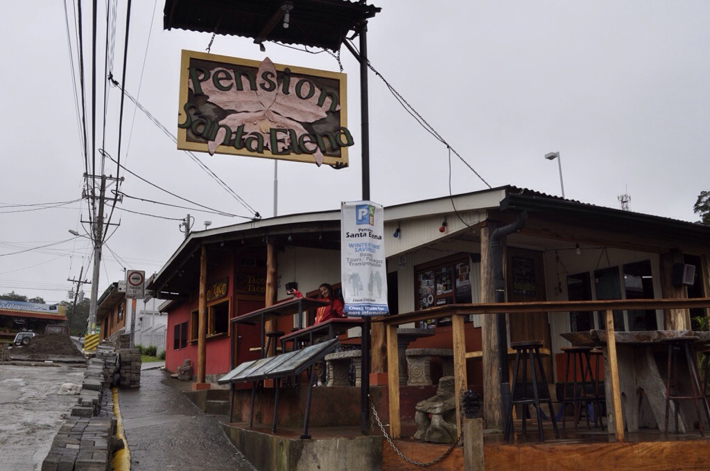Aber jetzt zum Trip. Am Samstag sind wir Richtung Monteverde gefahren. Die Strasse dorthin bzw. die letzten 40 Kilometer waren katastrophal. Dieser Weg war steinig und schwer!! 😉 So sind wir dann um ca. 14:30 Uhr in Monteverde angekommen. Leider war das Wetter nicht so schön und es hatte nur ca. 24 Grad. So mussten wir uns zuerst an die kältere Luft gewöhnen. Monteverde liegt 172 km nordwestlich von San José in der Cordillera de Tilarán, auf der Kontinentalscheide Costa Ricas in einer Höhenlage zwischen 1400 und 1700 m. Ausgangspunkt zu allen Sehenswürdigkeiten ist die kleine Ortschaft Santa Elena, die im Zentrum der Region gelegen ist. Das kleine Dorf ist stark vom Tourismus geprägt, und es bietet den Besuchern eine grosse Auswahl an Übernachtungsmöglichkeiten und Aktivitäten. So hatten wir uns auch eine Unterkunft in Santa Elena ausgesucht: Pension Santa Elena Dort angekommen buchten wir direkt eine Tour für am Abend. Beim „Night Walk“ sollte man viele Tiere sehen, Betonung auf SOLLTE. Bei Regen haben wir uns 2h lang im Jungle nach den Tieren umgeschaut. Zum Glück hatten wir einen Guide dabei, der die kleinen Krabbeltiere gesehen hatte. Jedoch hatten wir nur Spinnen, Schlangen, Frösche, Ameisen, Insekten, schlafende Vögel und einen Fuchs gesehen. TOLL! 😉 Am Sonntagmorgen wurden wir um 7:30 Uhr abgeholt. Wir buchten eine Canopy Tour mit Aventura. Es hat zwar geregnet, jedoch war es sehr lustig und abenteuerlich. Der Tarzan Swing am Schluss war die Krönung. Obwohl die Tour $45.- gekostet hatte, kann ich die Tour empfehlen. Danach fuhren wir zurück resp. nach Arenal/Fortuna. Athena war schon geübt mit den Strassen und deshalb benötigten wir für die schlimmen 40 Kilometer weniger Zeit als bei der Hinfahrt. Well done Athena!!! Und übrigens, ich war bei diesem Strassenabschnitt sogar eingeschlafen, hahaha.