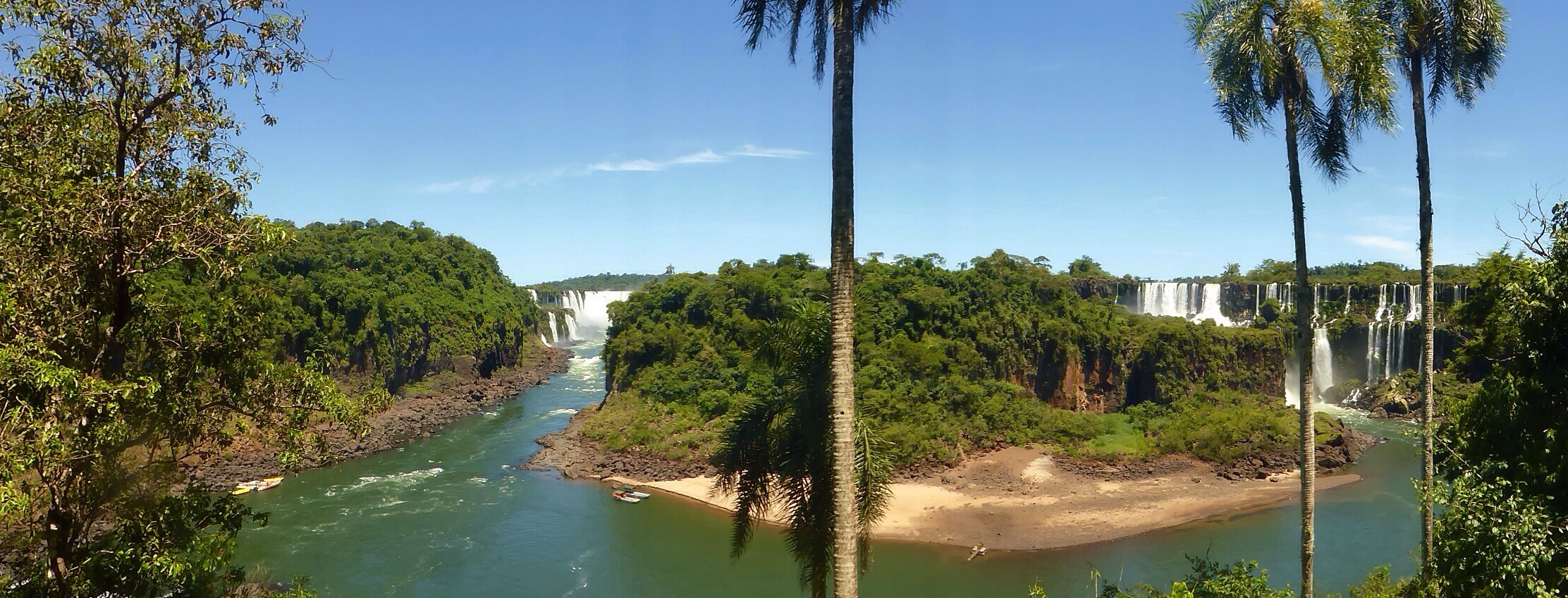 Die Wasserfälle von Iguazú befinden sich direkt an der Grenze zwischen Brasilien und Argentinien. Gemessen an ihrer Breite sind sie die grössten Wasserfälle der Welt. Sie bestehen aus 20 grösseren sowie 255 kleineren Wasserfällen auf einer Ausdehnung von 2,7 Kilometern.