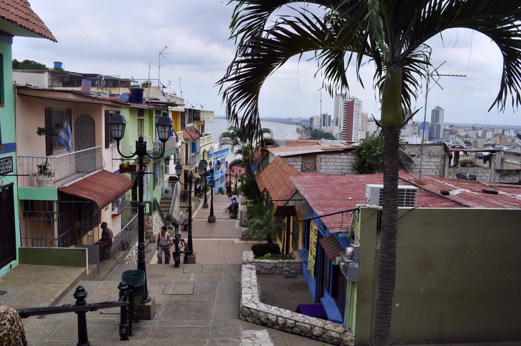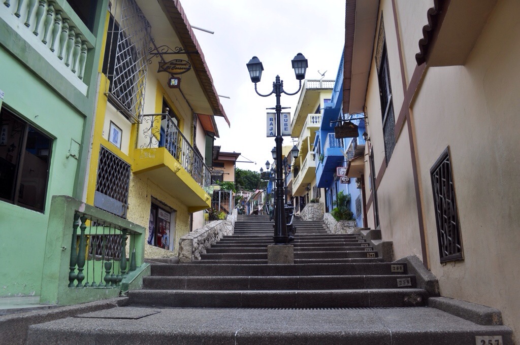 Tja und da sass ich dann alleine im grossen Dreibettzimmer. Als ich meine 7 Sachen zusammenpackte, hatte ich mit mir bzw. mit der Situation zu kämpfen. Ich war verwirrt, deprimiert und traurig, dass die Reise nun ein Ende nimmt. Ich konnte kaum einschlafen. Tausende Gedanken gingen mir durch den Kopf. Am nächsten und zugleich am letzten Tag (30.05.2014) musste ich das Zimmer um 12:00 Uhr verlassen. Ich wollte nicht den ganzen Nachmittag im Hostel verbringen und die Zeit absitzen. Da ich euch noch Fotos von Guayaquil schuldig war, machte ich mich auf auf den Weg zum Malecón, der Uferpromenade von Guayaquil. Ich lief am Malecón entlang bis zu den Peñas, einem farbenfrohen Vierten am Hügel gelegen. Dort bestieg ich 444 Stufen und erreichte den höchsten Punkt mit toller Aussicht über Guayaquil. Kurz innegehalten und weiter gings. An der Promenade gibt es ein leckeres Restaurant Resaca, wo ich mir Reis mit Crevetten gönnte. Nach dem Essen wollte ich zum Parque Bolívar. Dort gibt es riesige Galapagos-Leguane. Zum Glück schrieb ich vorher noch mit Steffelyne, welche bereits am Flughafen in Quito waren. Ich war etwas verwirrt und fragte, um welche Zeit sie nach Guayaquil fliegen. Ich bemerkte dann, dass der Flug nach Amsterdam bereits um 18:45 Uhr ging und nicht erst um 19:45 Uhr. Da beschloss ich den Park auszulassen und direkt zum Hostel zu gehen. Ein Taxi brachte mich zum Flughafen, wo ich dann knapp eine Stunde am Check-in-Schalter anstehen musste. Da traf ich nach langer Zeit wieder auf Europäer, die sich göttlich aufregten, dass die Schlange nicht vorwärts ging. Ich hingegen war völlig relaxed und sagte nur: Geduld sei die Lösung 🙂 Mal abwarten wie lange ich diese Ruhe und Gelassenheit mit mir herumtragen werde. Am Gate traf ich die auch etwas verwirrten Ladies wieder. Im Flugzeug ertönte es vom Kapitän: Welcome on board… We will have a 10 hours flight to Amsterdam… „ha, ein Katzensprung“!