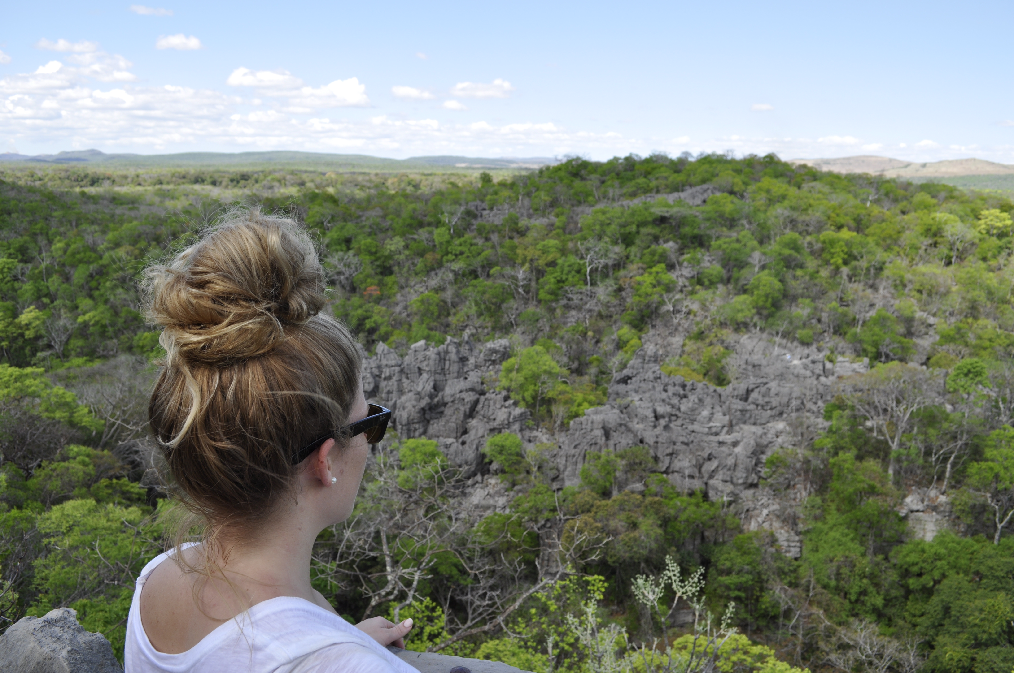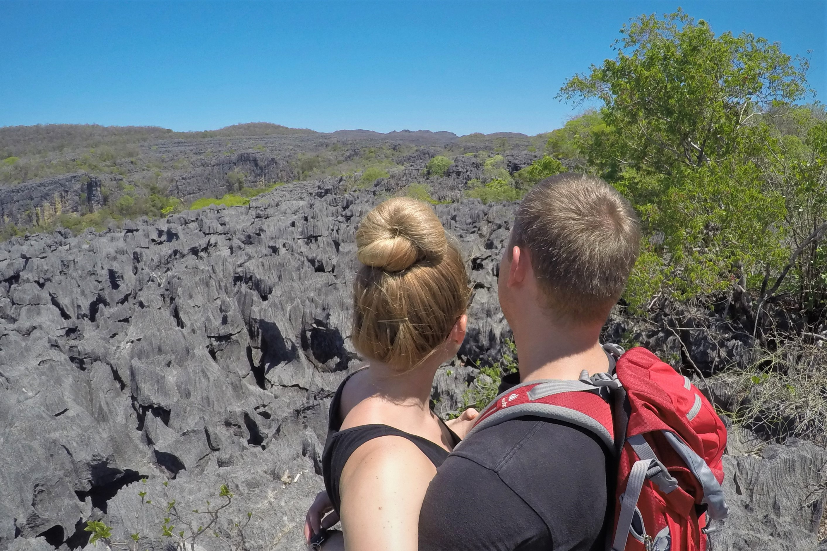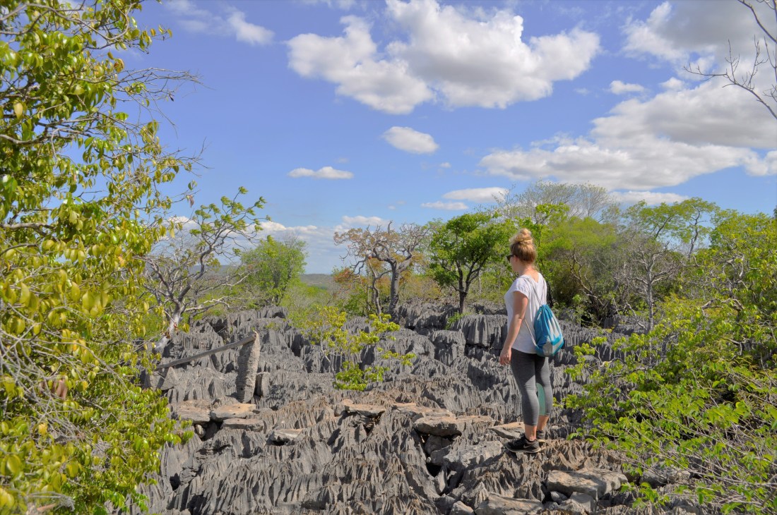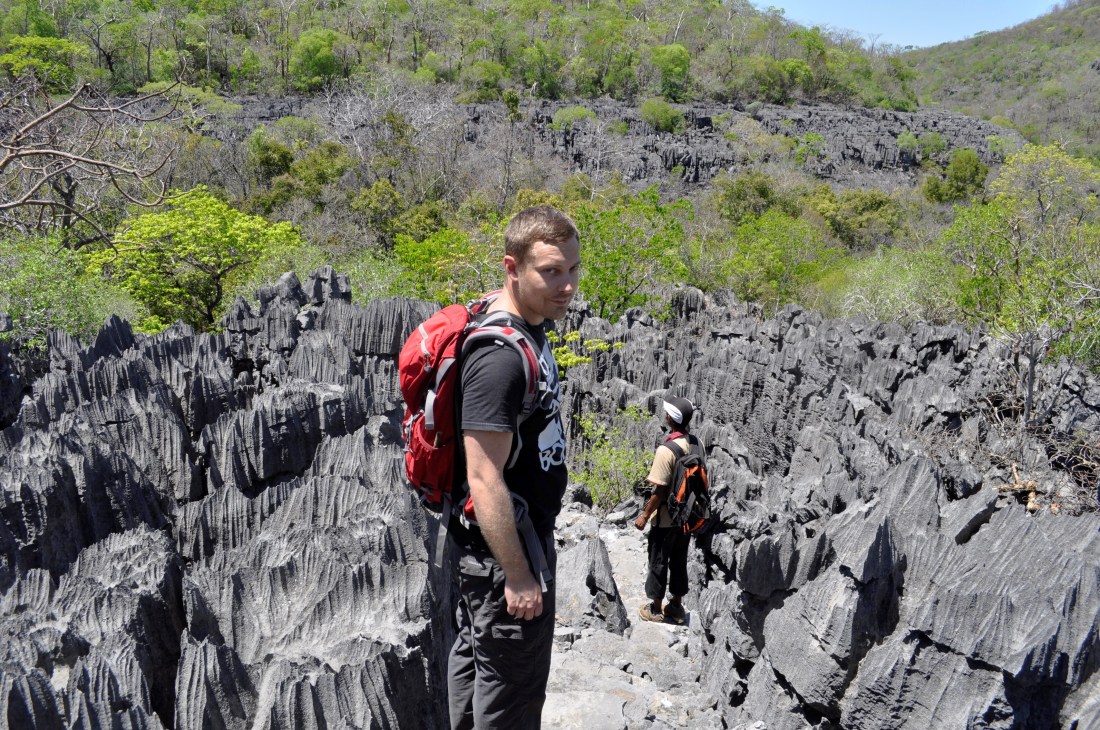 Nach dem einfachen Sandwich-Lunch führte uns der Guide in eine riesige Höhle namens Grotte des Chauve-Souris. Hunderte steile Stufen führten uns zu ihr. Von weitem konnten wir Fledermäuse kreischen hören. In der Höhle erwartete uns eine extrem drückende Schwüle, das Tshirt war nun definitiv platschnass. Mit einer kleinen Taschenlampe bewaffnet kraxelten wir in die Dunkelheit unserem Guide hinterher. Die Höhlenbesichtigung war für mich eine echte Mutprobe, denn leider hausten hier nicht nur Fledermäuse. Nachdem der üble Gestank der Fledermäuse so richtig tief in der Nase sass, wollte der Guide noch tiefer in die Höhle hinein. Als ich dann aber ein Skorpion entdeckt hatte, war bei mir Schluss. Christian willigte ein nicht weiter in die Höhle hinein zu gehen. Evt. lag es auch an der Riesenspinne, die er neben dem Skorpion entdeckt hatte. Netterweise hatte er diese erst draussen erwähnt – ich hatte sie glücklicherweise übersehen. Nach der Grotte endete die Tour mit einem wunderschönen Ausblick von dem Aussichtspunkt auf die scharfkantigen Kalksteinskulpturen (Tsingys).